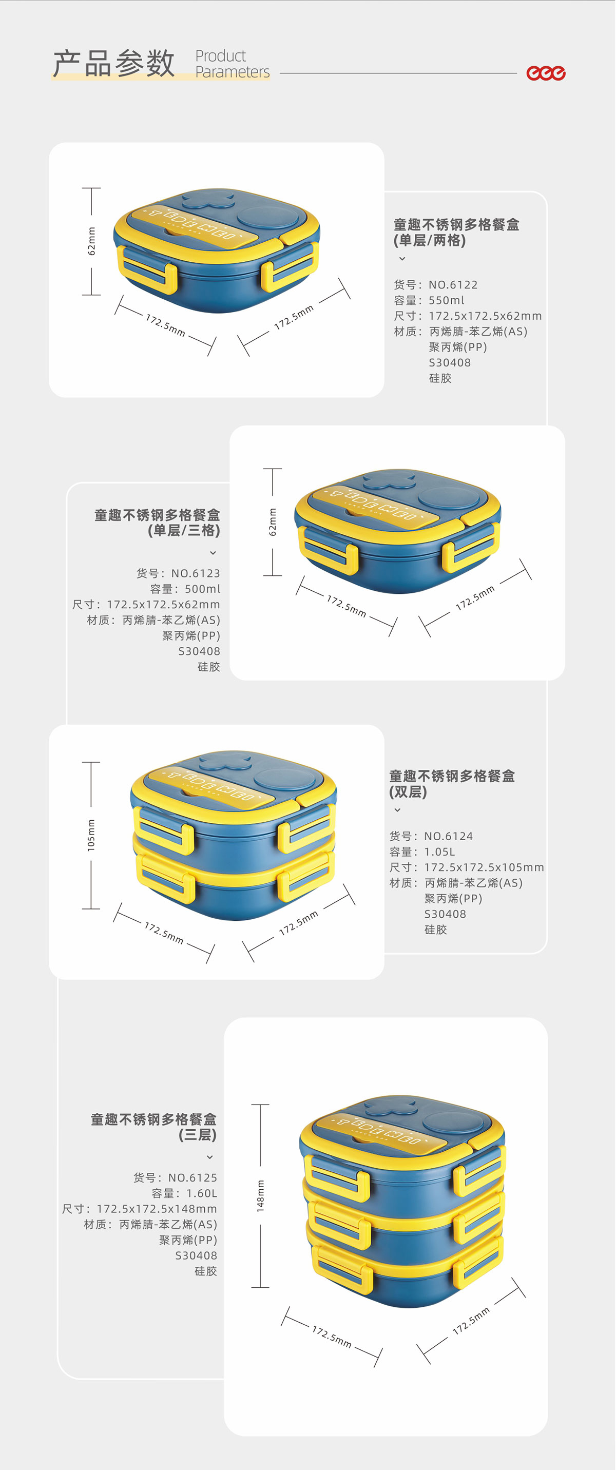 HM-6123(單層餐盒(三格)):173*173*62mm