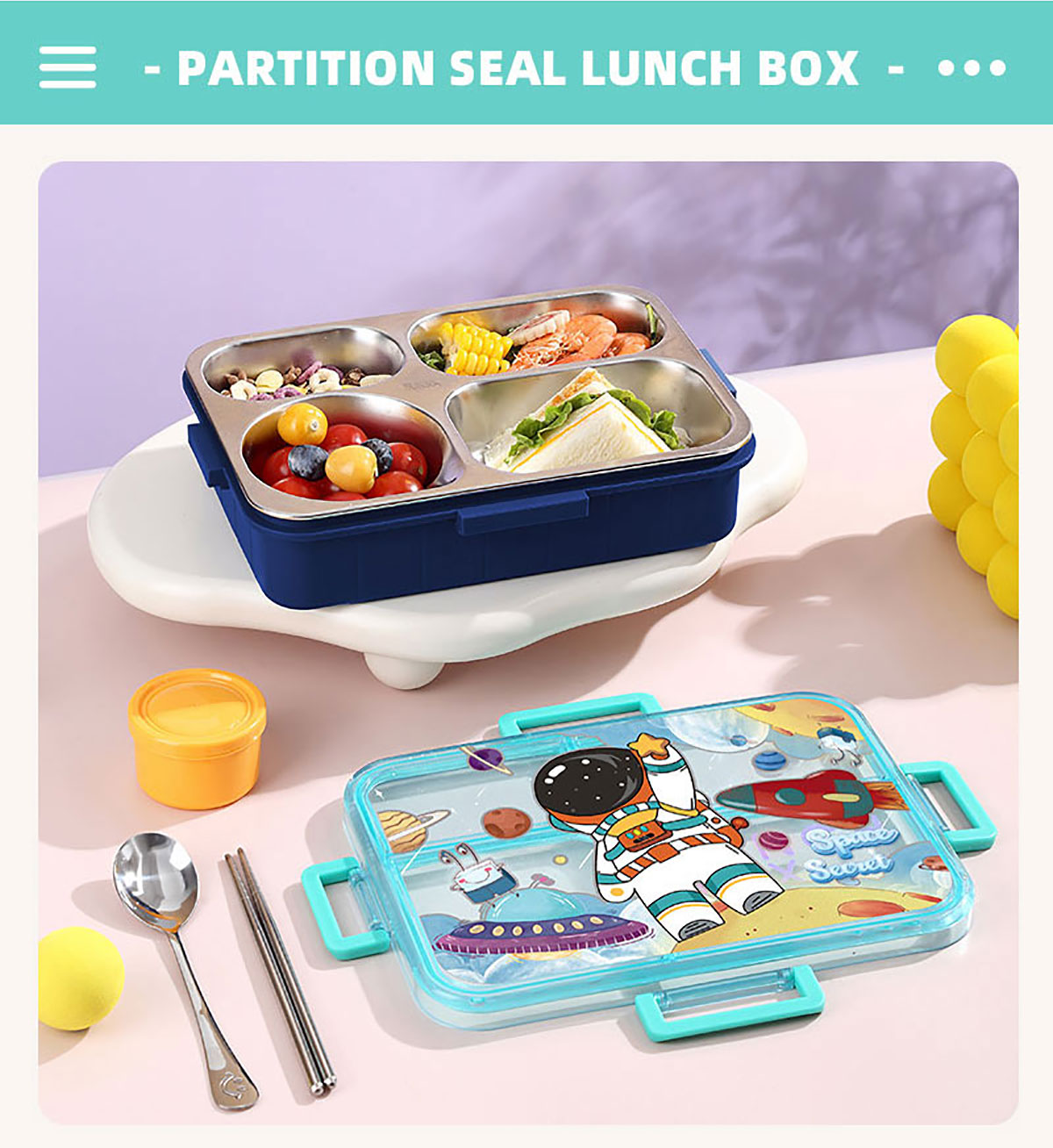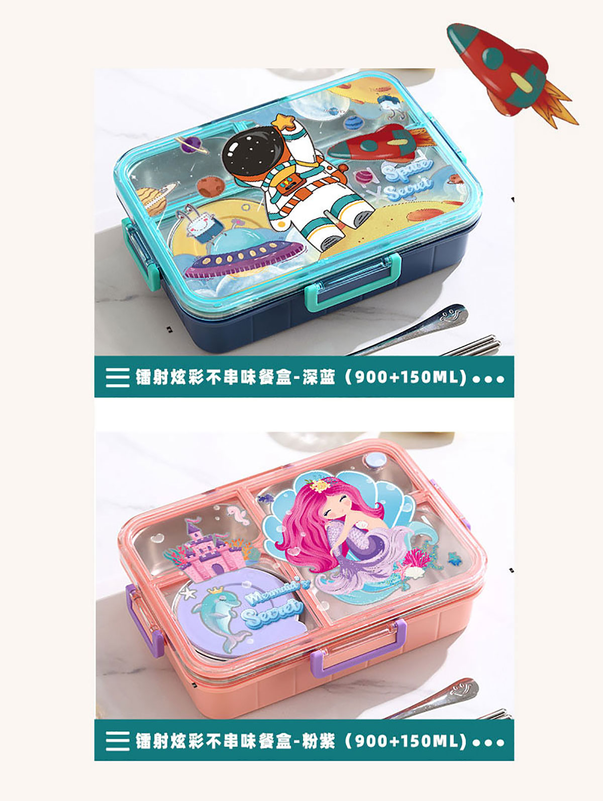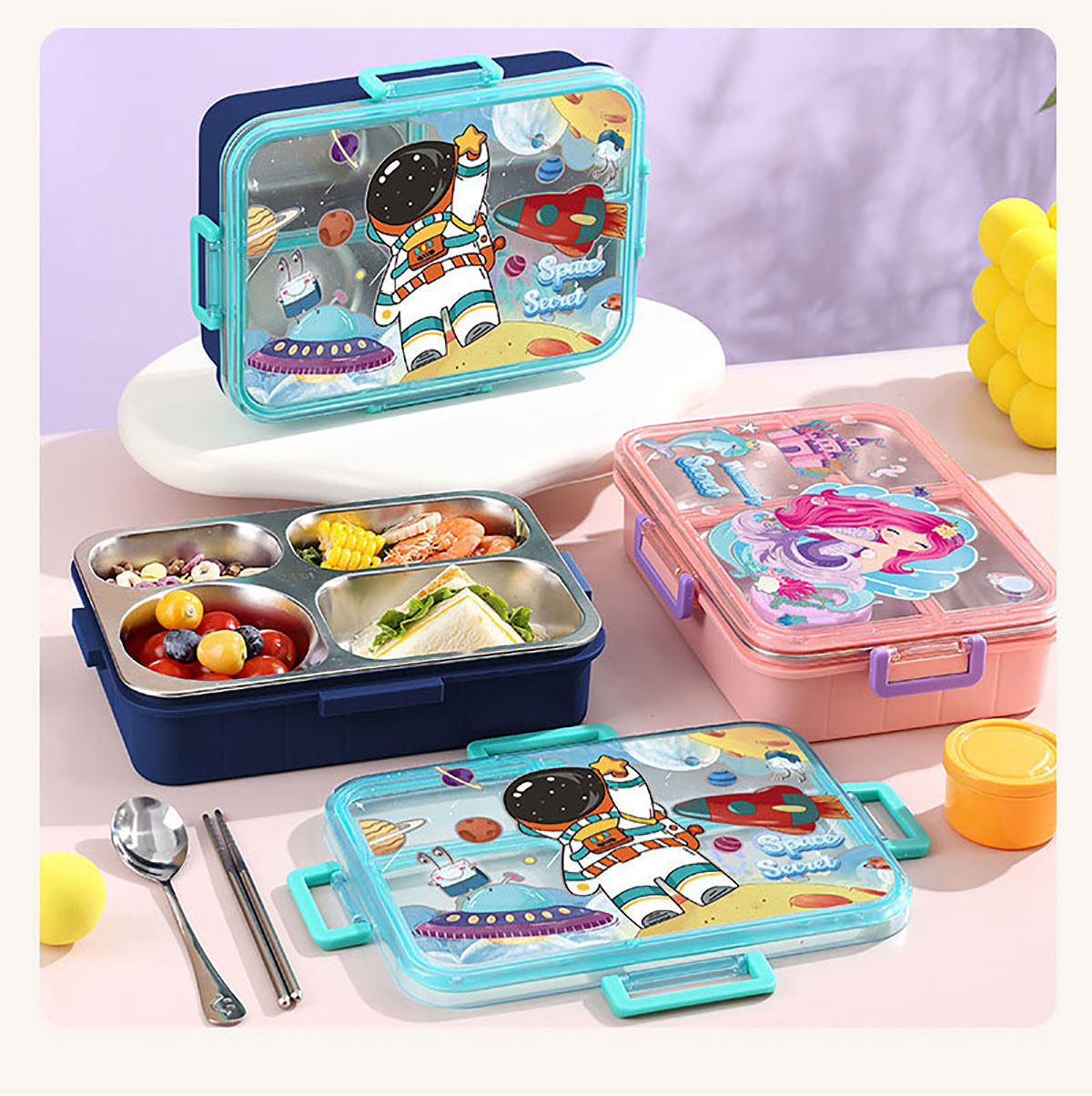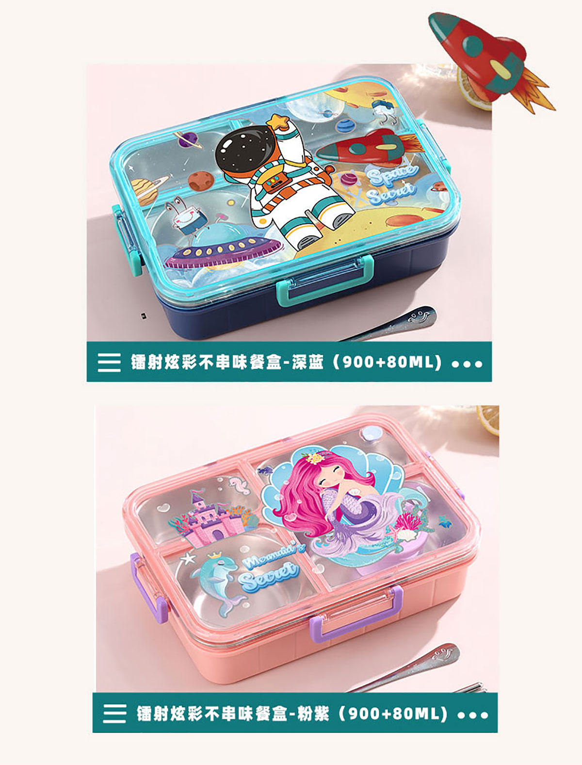 彩光卡通不串味餐盒(不銹鋼4格900ml+醬料杯80ml/鋼碗150ml)