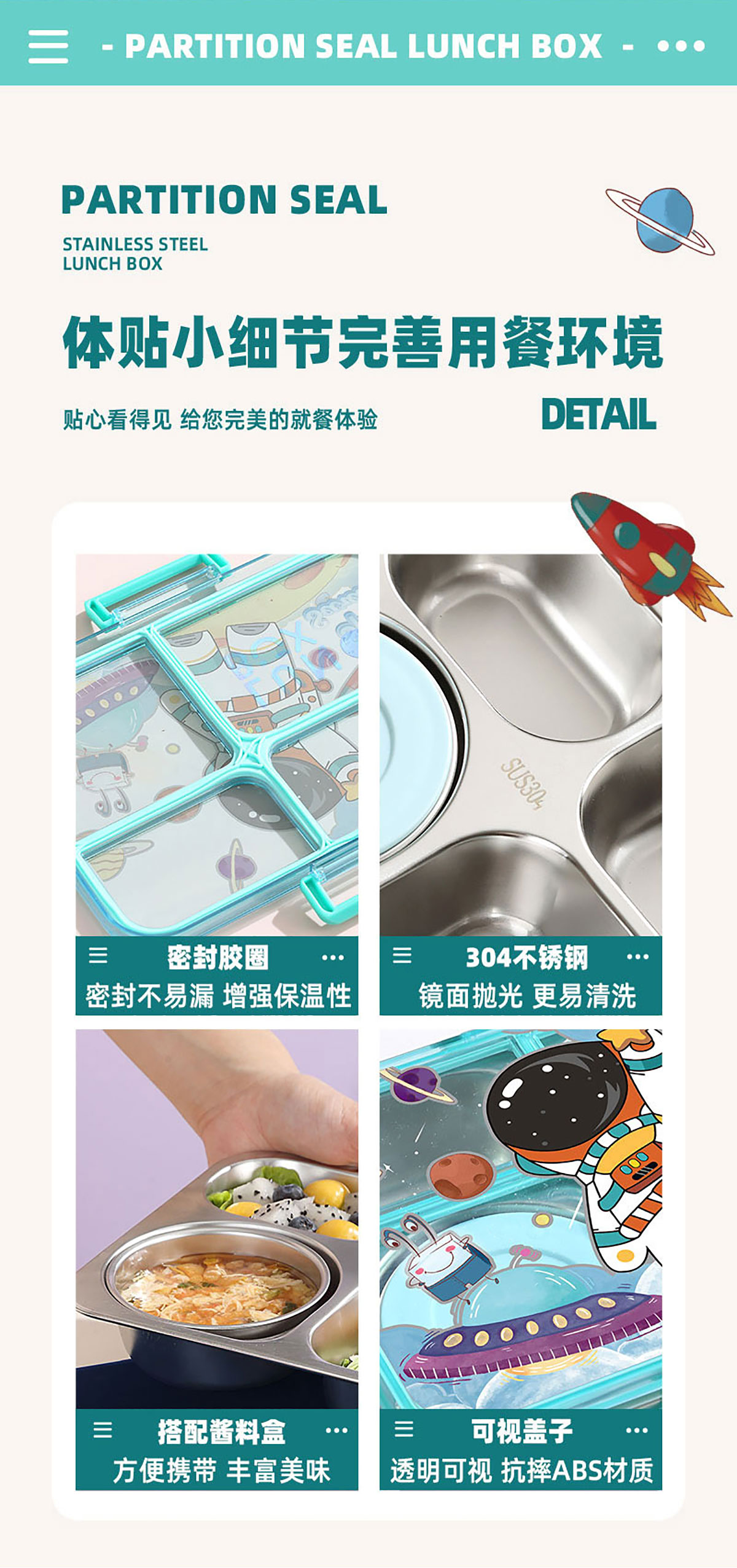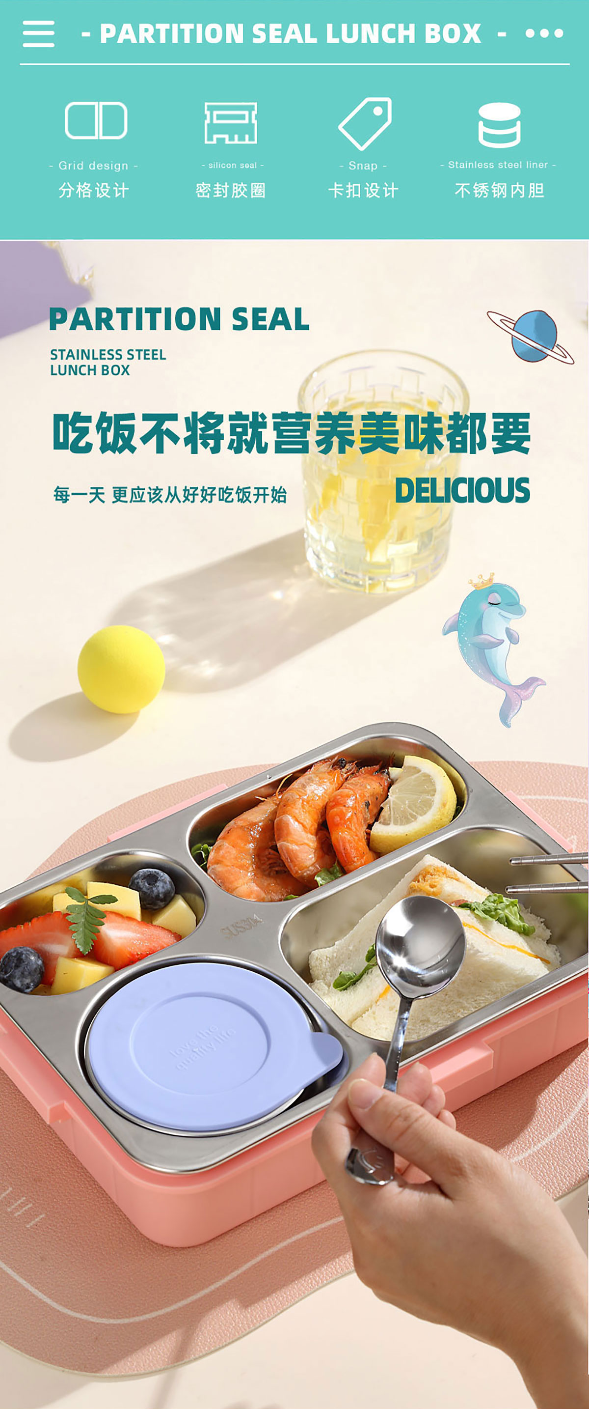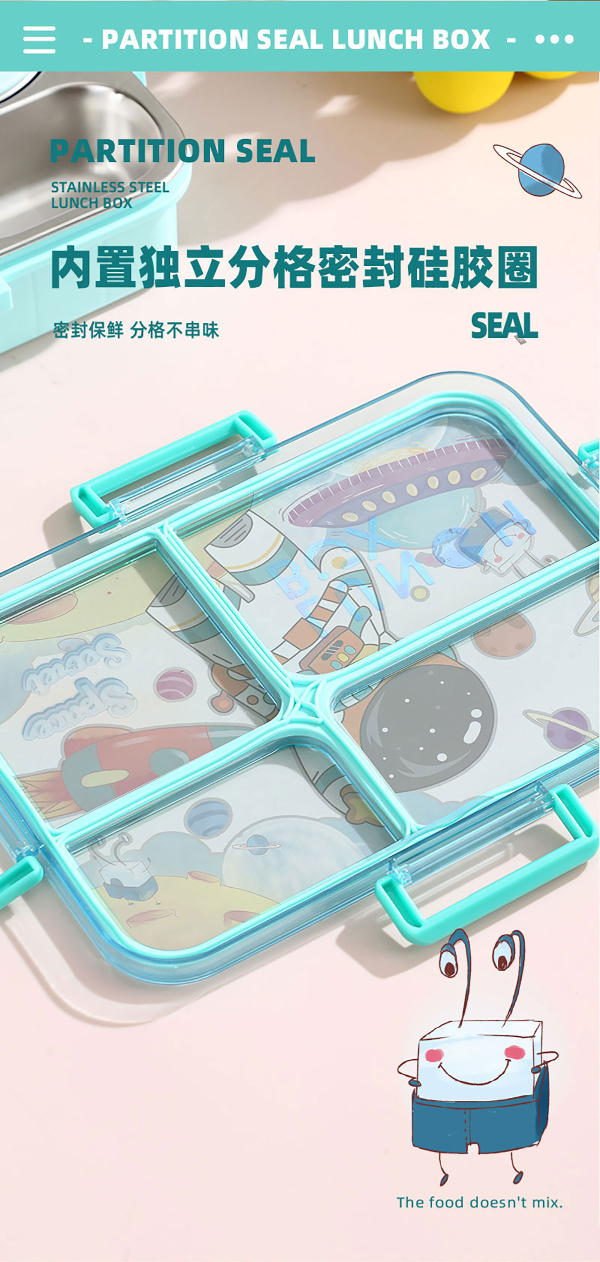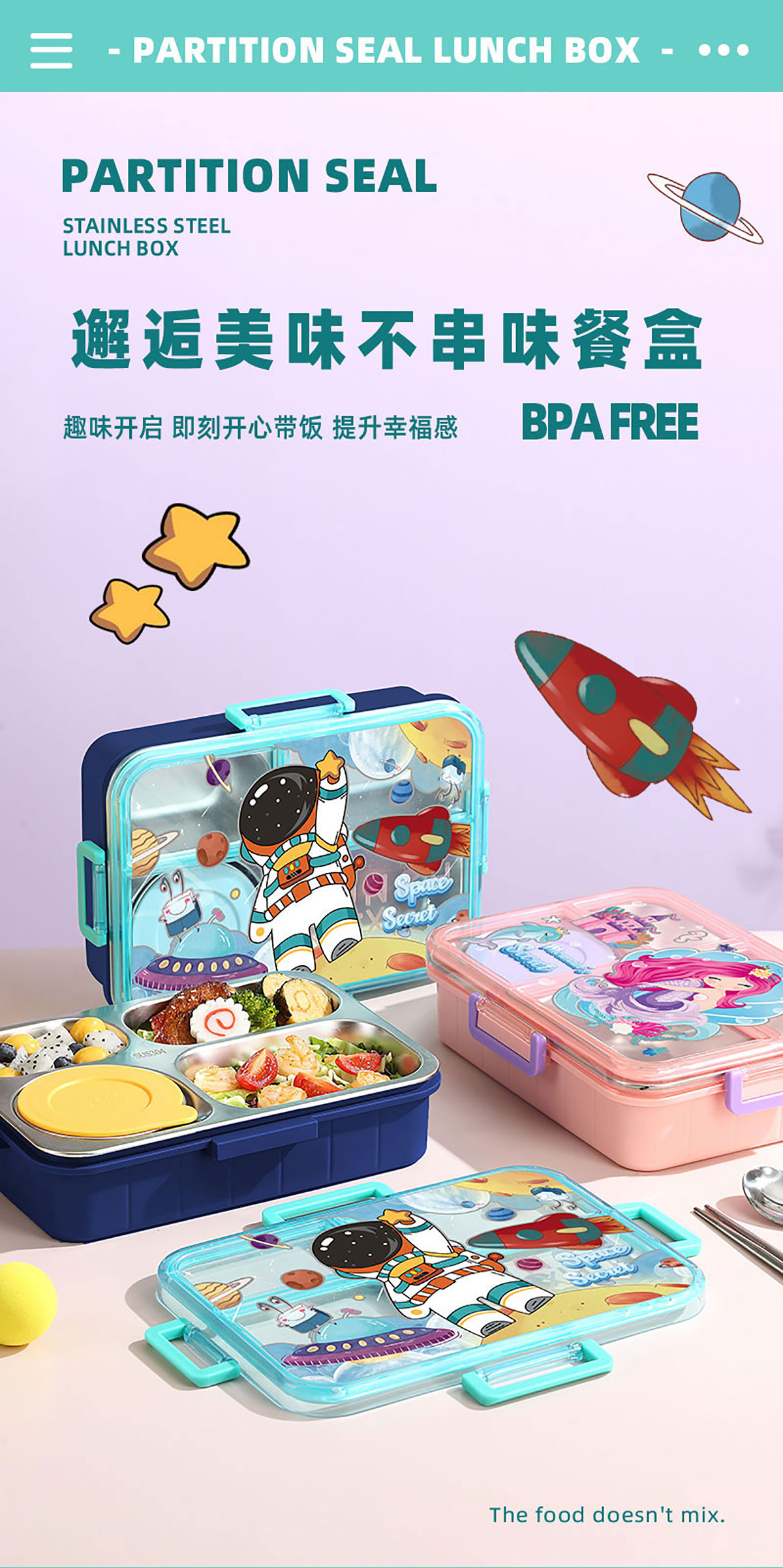 彩光卡通不串味餐盒(不銹鋼4格900ml+醬料杯80ml/鋼碗150ml)