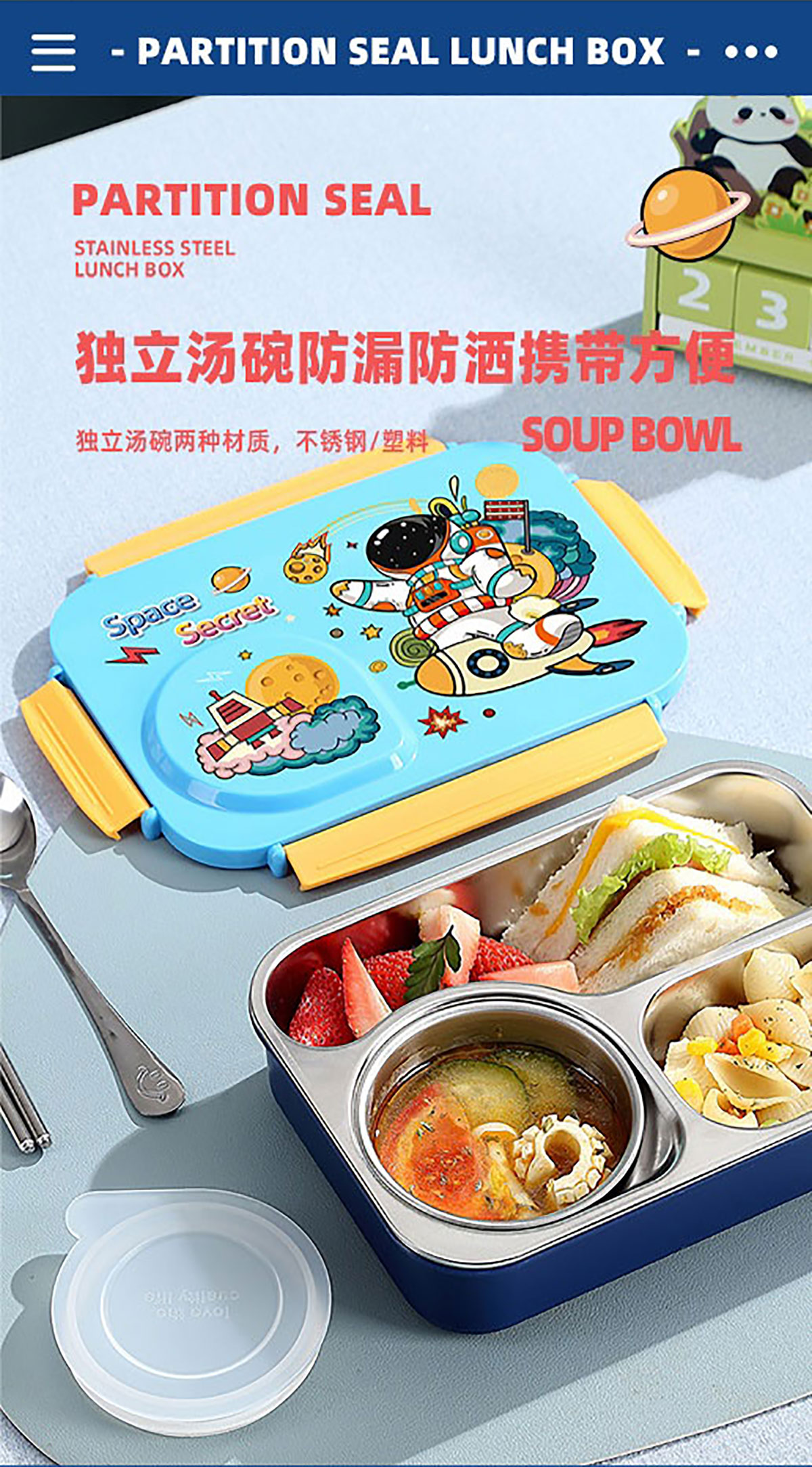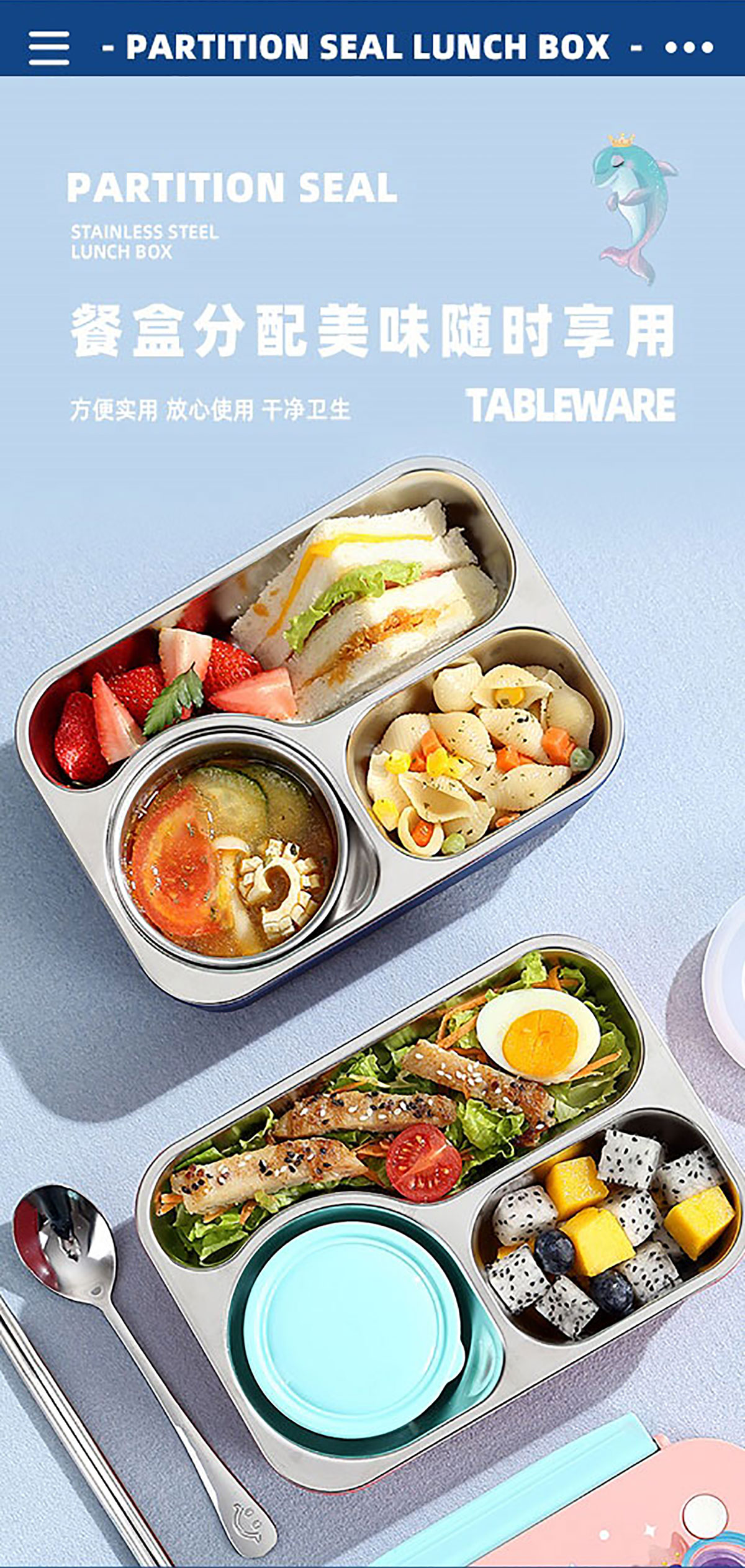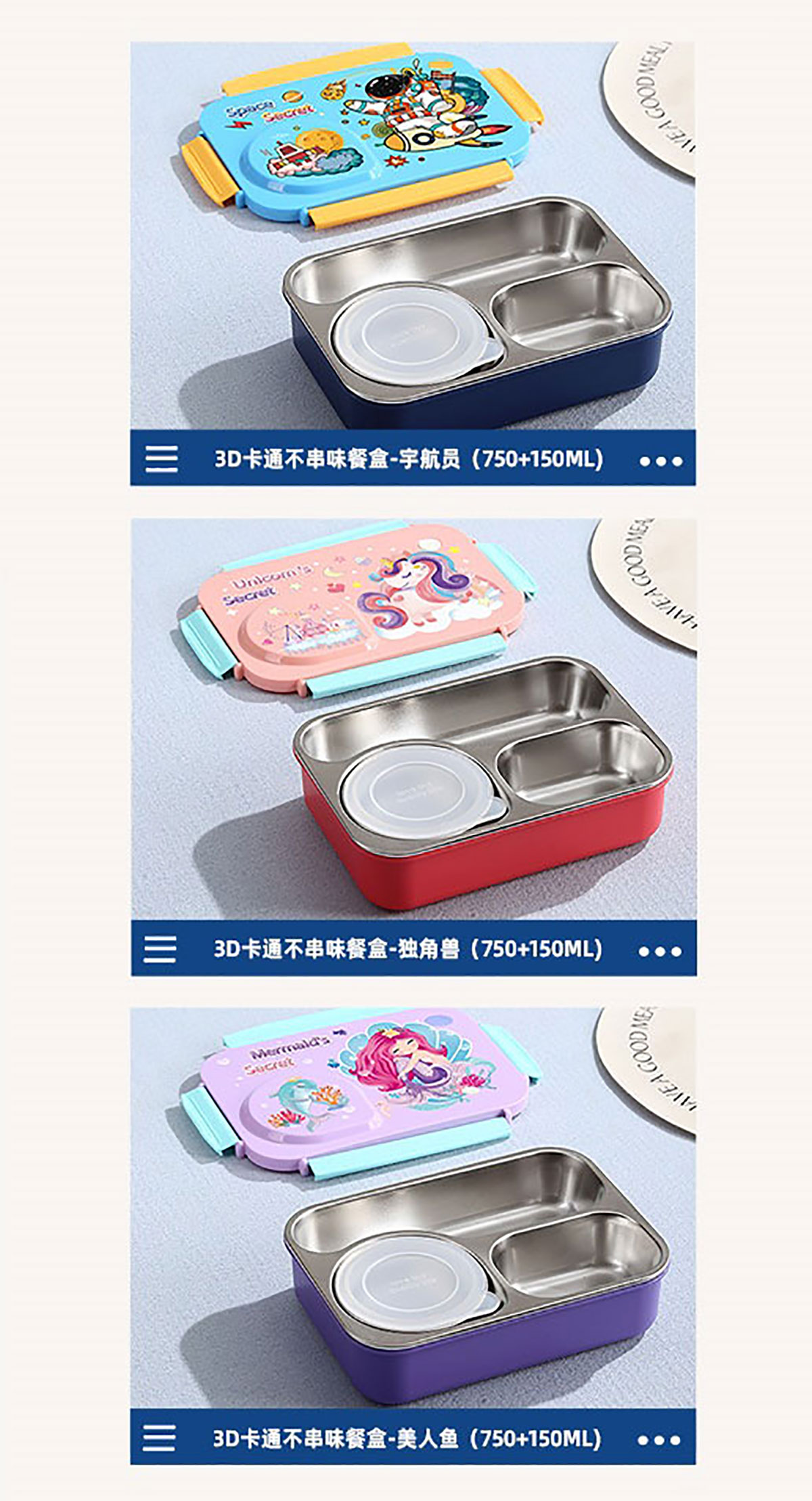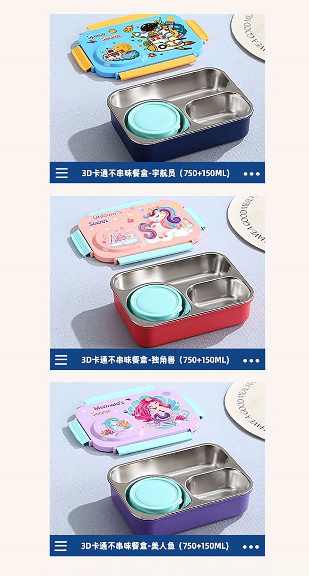 3D卡通不串味餐盒(不銹鋼3格750ml+塑料碗/不銹鋼碗150ml+不銹鋼勺筷)