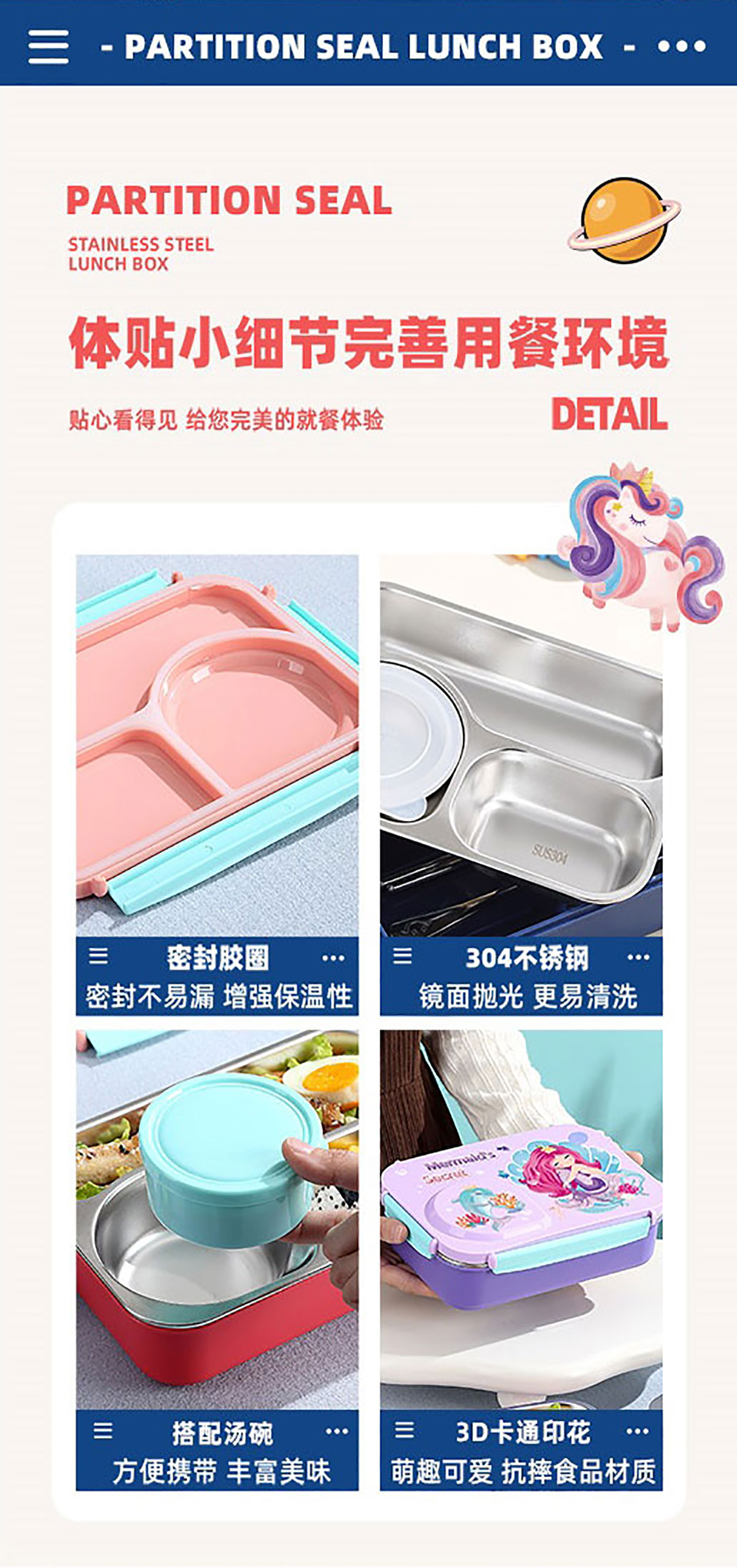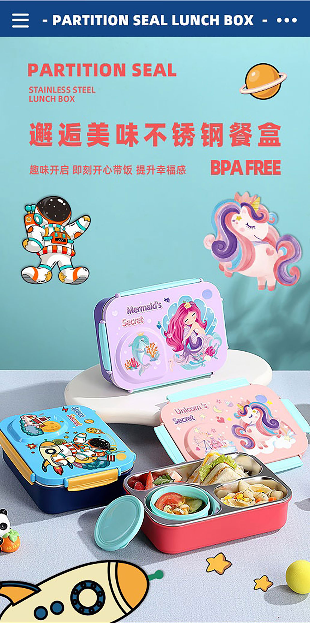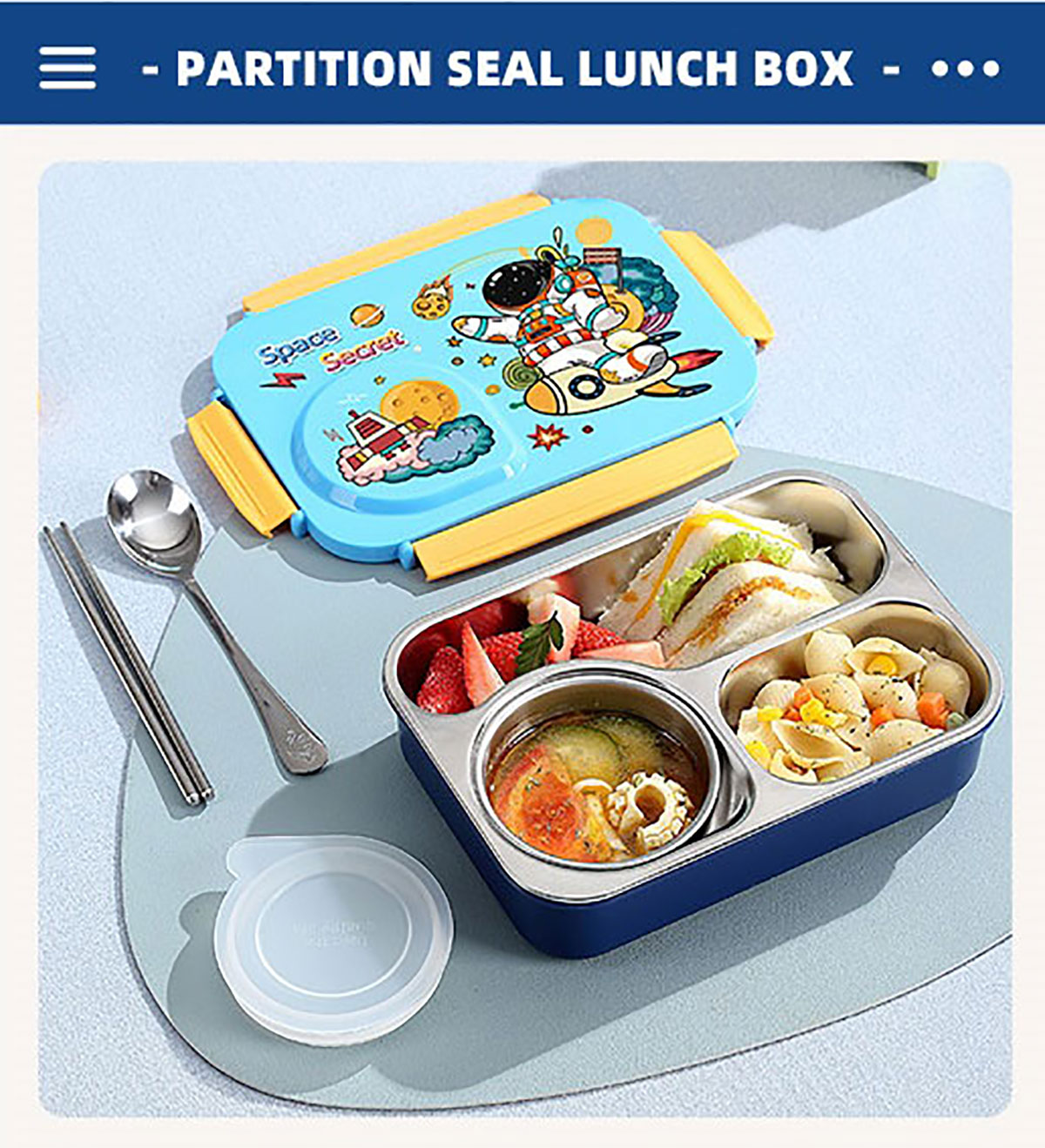 3D卡通不串味餐盒(不銹鋼3格750ml+塑料碗/不銹鋼碗150ml+不銹鋼勺筷)